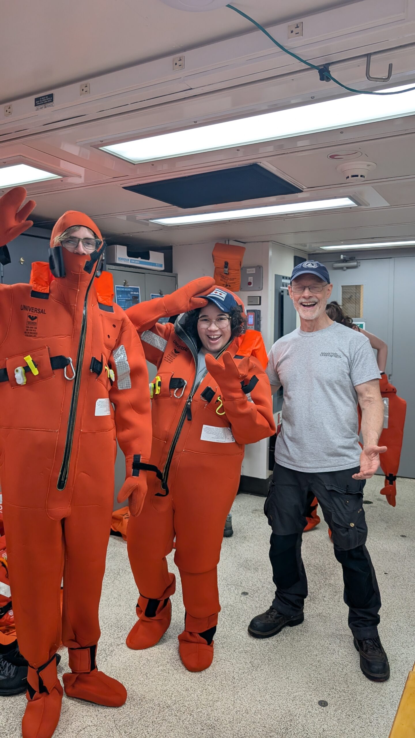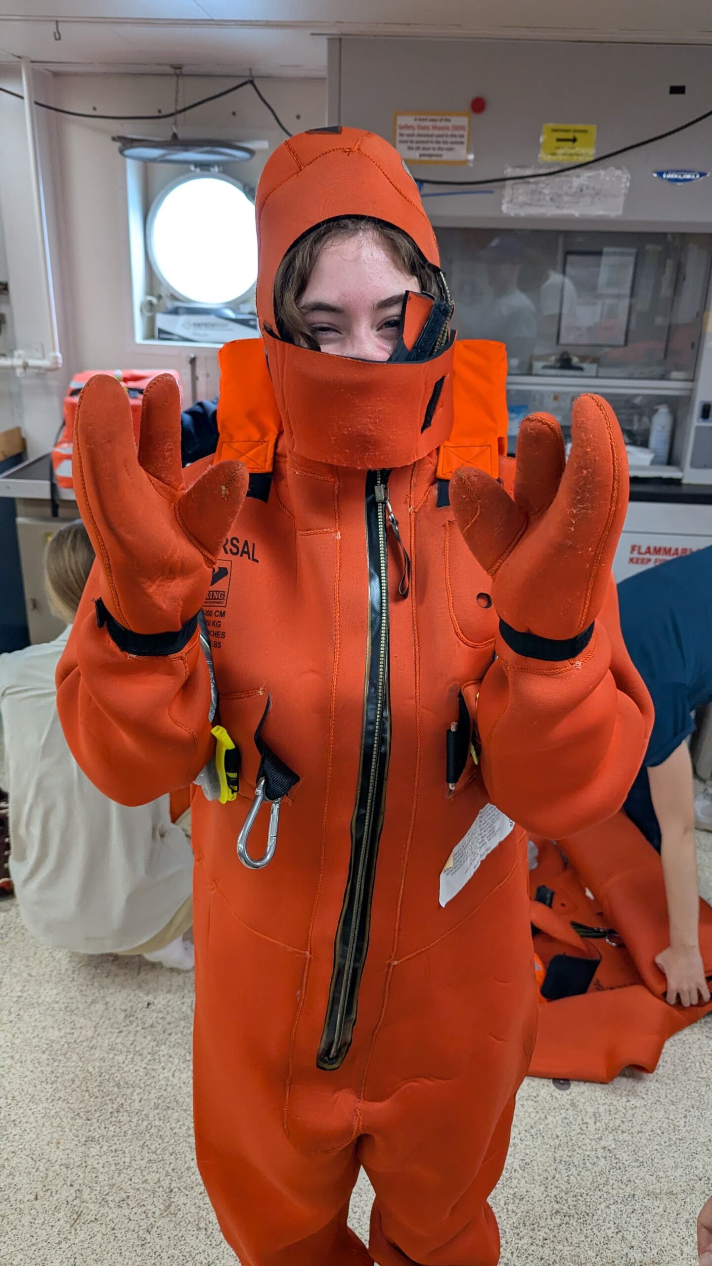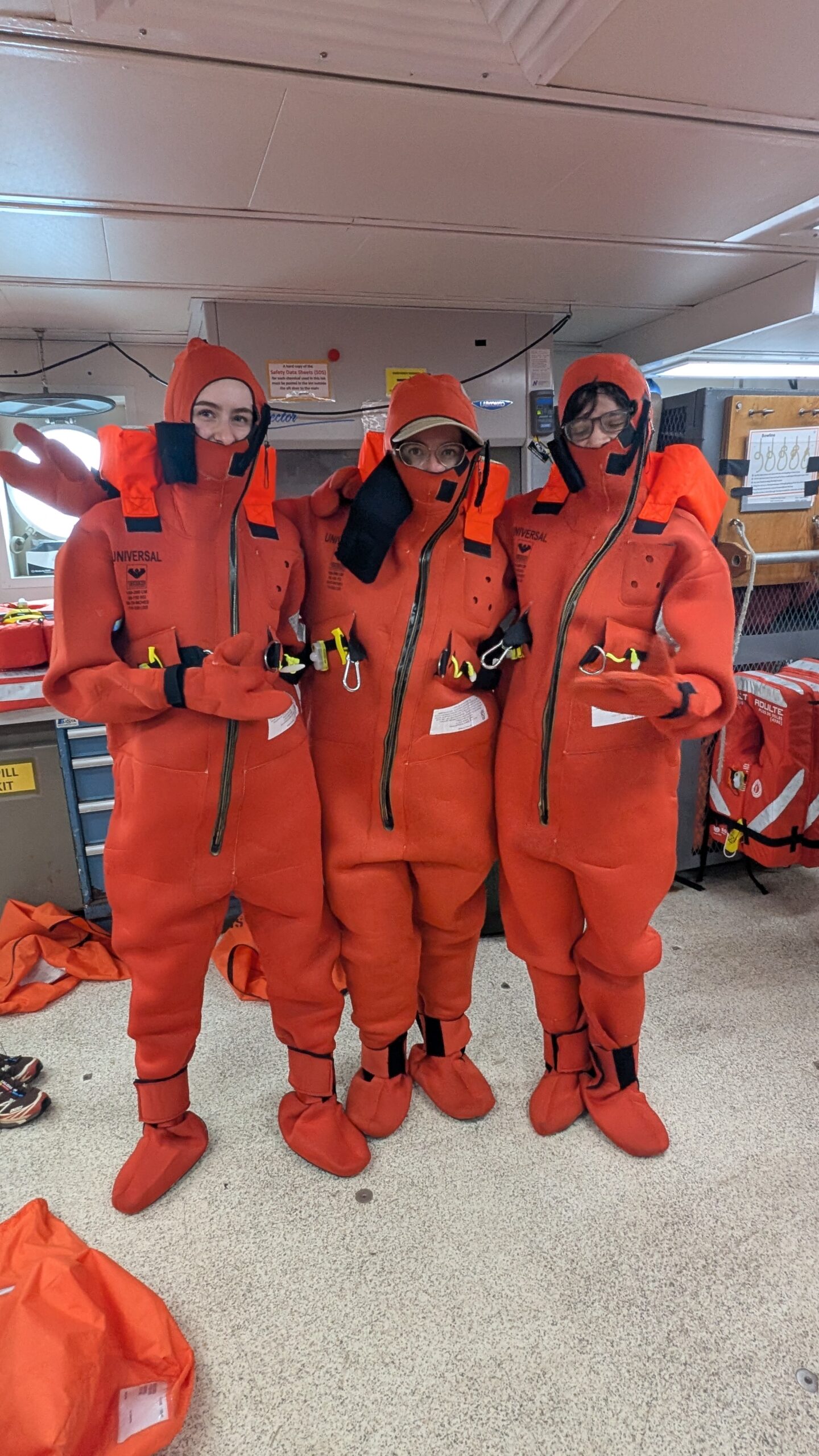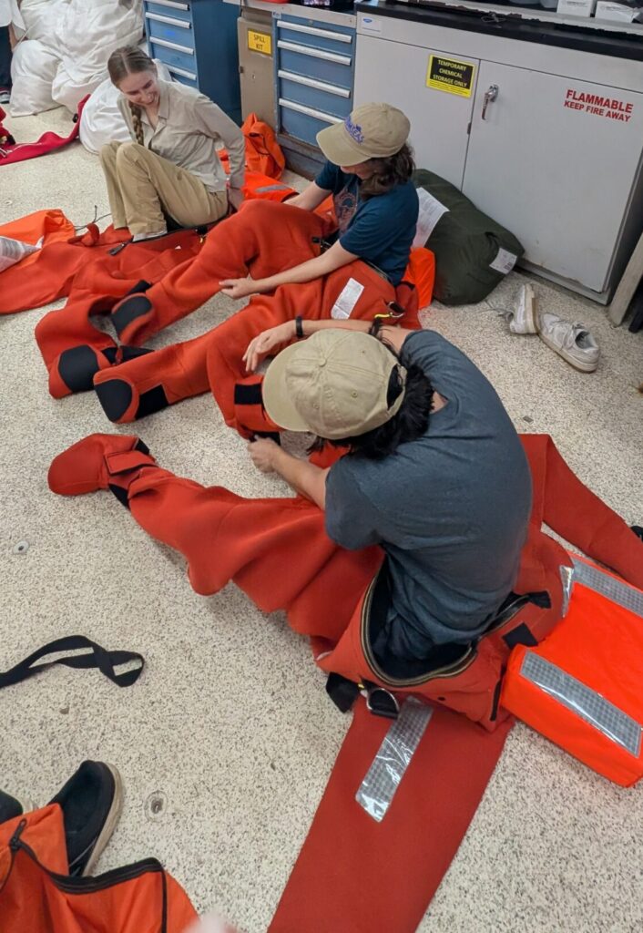 We started out the day with get-to-know you lectures from our super cool mentors, Becky, Sheldon, and Jeanette. These small get-to-know-yous ended up taking forever (in a good way) because that’s what happens when you put 8 inquisitive students in one room. After all that, we went to eat a delicious lunch, and at 1230, headed to muster. Muster is basically a general fire and safety drill. Muster allowed me to realize my long-time dream of becoming a lobster, by squeezing into the famous red immersion suit as seen on past STEMSeas expeditions.
