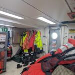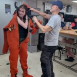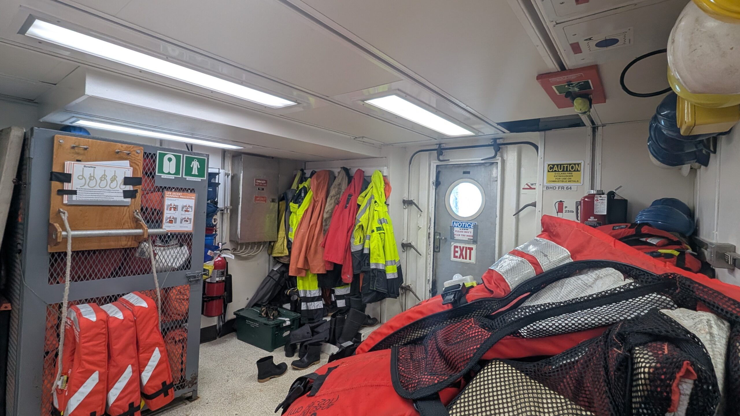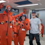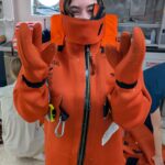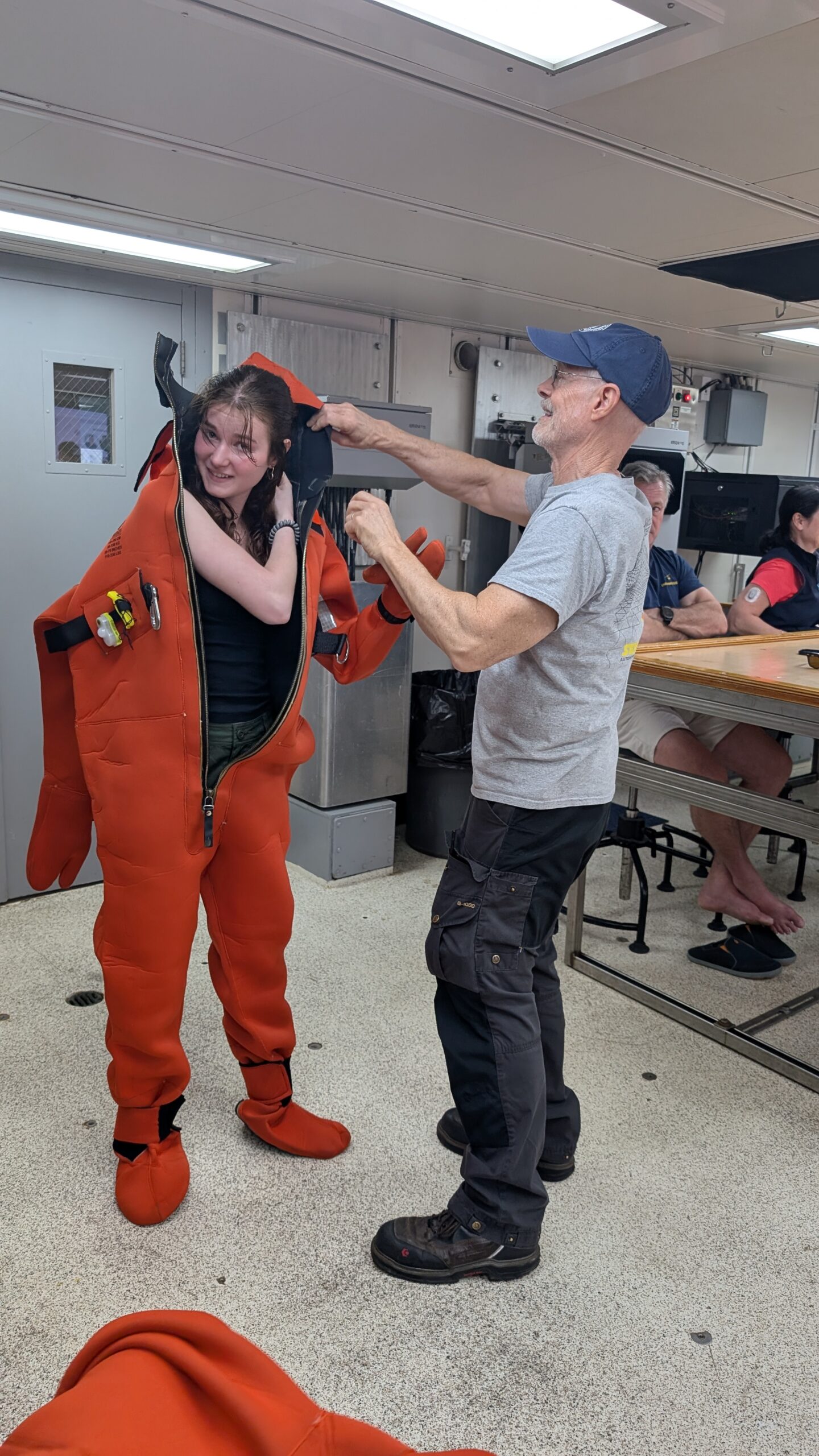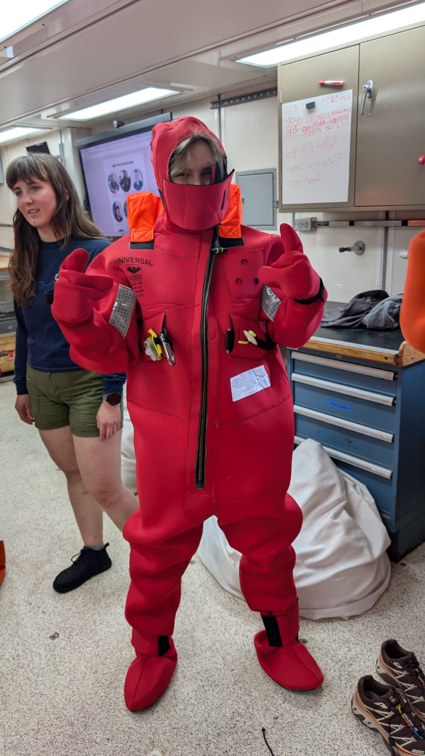 We started out the day with get-to-know you lectures from our super cool mentors, Becky, Sheldon, and Jeanette. These small get-to-know-yous ended up taking forever (in a good way) because that’s what happens when you put 8 inquisitive students in one room. After all that, we went to eat a delicious lunch, and at 1230, headed to muster. Muster is basically a general fire and safety drill. Muster allowed me to realize my long-time dream of becoming a lobster, by squeezing into the famous red immersion suit as seen on past STEMSeas expeditions.